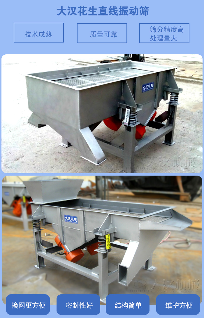 大漢牌花生直線篩是在大漢機械工程師利用原有國內外直線篩生產工藝基礎上再根據對一線直線篩客戶使用情況的跟蹤調查總結的意見和建議而研發、改良一款高性能直線振動篩分機,具有技術成熟、質量可靠、使用方便、篩分效率/精度高、處理量大、篩網使用壽命長等特點;大漢DZSF-1020直線振動篩適合篩分各種物料,可以明顯提高產量,更適合對產量要求大的客戶選擇。