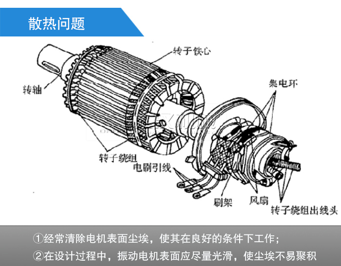 預防措施:①經常清除電機表面塵埃,使其在良好的條件下工作;②在設計過程中,振動電機表面應盡量光滑,使塵埃不易聚積,如果在粉塵較大的環境下工作,應考慮減去機殼表面的散熱筋,因為此時,散熱筋不僅起不到散熱作用,反而易使粉塵堆積,阻礙電機散熱。