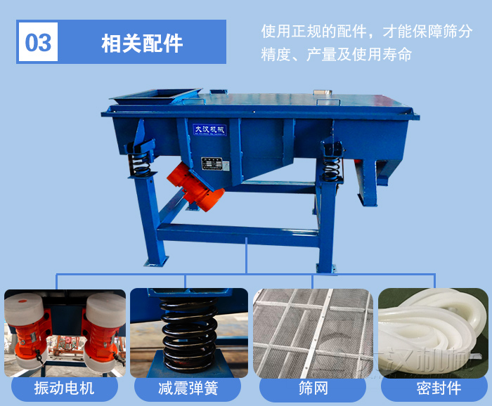 直線振動篩的配件包含:振動電機、減震彈簧、密封件、篩網(wǎng)、清網(wǎng)裝置,振動電機作為臺篩分設(shè)備的動力源其優(yōu)劣直接關(guān)系到設(shè)備的產(chǎn)量與使用壽命,篩網(wǎng)的選用也應(yīng)該注重篩網(wǎng)的絲經(jīng)、材質(zhì),配件需要有正規(guī)的配件供應(yīng)商提供,這樣才能保障篩分精度、產(chǎn)量及使用壽命,而選擇不同配置的設(shè)備,其價格勢必會有所影響,舉例來說,防爆電機與普通電機相比,價格會貴200-300元,非金屬篩網(wǎng)相較金屬篩網(wǎng)會便宜50%。