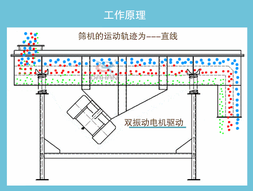 不銹鋼直線振動篩工作原理可分為動力來源、運(yùn)動傳遞、物料分離三個(gè)環(huán)節(jié),雙軸振動電機(jī)為設(shè)備提供動力、篩體作直線往復(fù)振動進(jìn)行動力傳遞,在直線振動和篩面傾角的共同作用下,會經(jīng)歷分層-透篩-分離的過程。