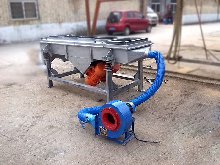 大漢機(jī)械降溫直線振動(dòng)篩這對(duì)高溫特性物料設(shè)計(jì)研發(fā),可在有效降低物料溫度后再對(duì)物料進(jìn)行篩分,有效的提高了篩分效率及處理量,下面以洗衣粉為例說(shuō)明風(fēng)冷式振動(dòng)篩的應(yīng)用。洗衣粉在剛剛完成生產(chǎn)后,通常為120度左右的高溫,如不進(jìn)行降溫處理,篩選分級(jí)非常困難,而洗衣服不適合傳統(tǒng)的水冷式降溫。在洗衣粉生產(chǎn)線上用“大漢牌”降溫式直線振動(dòng)篩,剛生產(chǎn)完成120度高溫洗衣粉通過(guò)輸送設(shè)備直接進(jìn)入風(fēng)冷式直線振動(dòng)篩,經(jīng)過(guò)安裝在設(shè)備進(jìn)料口底部的風(fēng)機(jī)降溫冷卻系統(tǒng),(不符合要求的結(jié)塊物料通過(guò)安裝在進(jìn)料口端的篩網(wǎng)篩選后從出料口旁的小型排料口排出,見下圖,該裝置可根據(jù)物料特性選裝),可直接將洗衣粉溫度降至40-50度后再進(jìn)入直線振動(dòng)篩完成篩選分級(jí)工作。