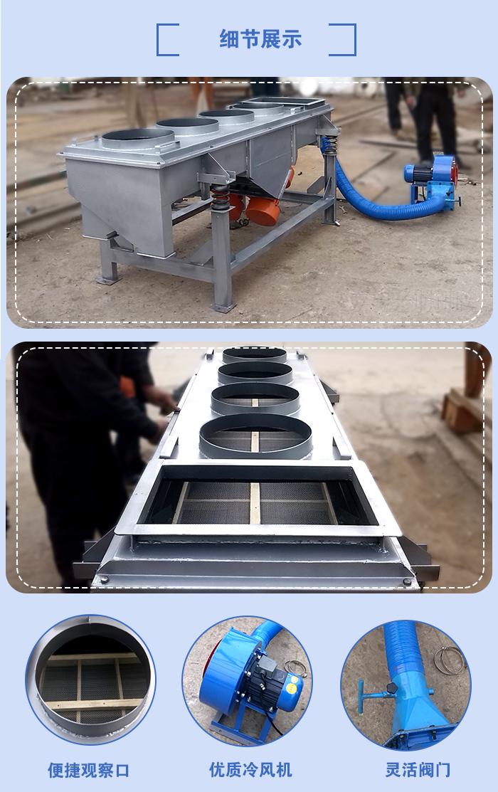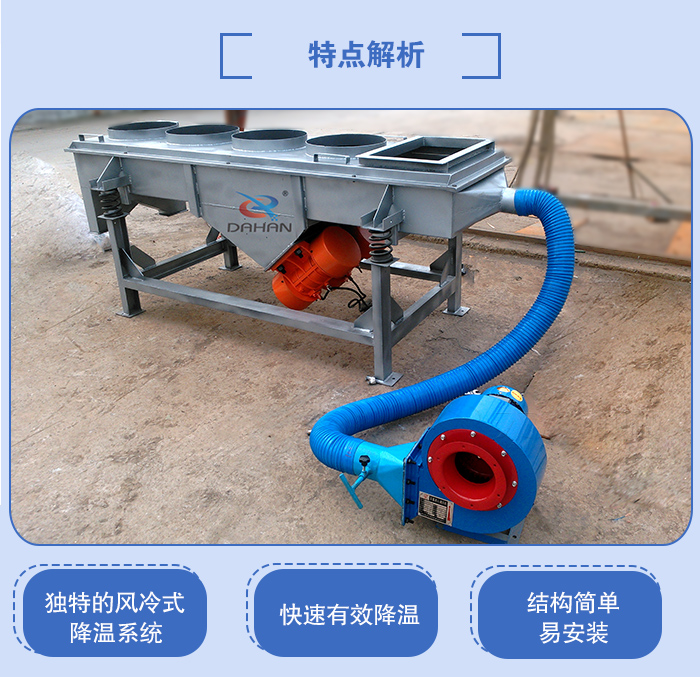 2、獨(dú)特的風(fēng)冷式降溫系統(tǒng)設(shè)計(jì),快速有效降溫,降溫后篩分效率更高;